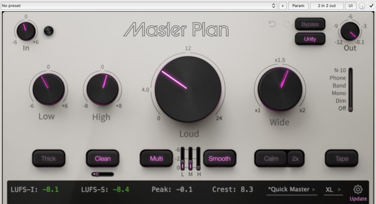Master Plan is a professional audio mastering workflow that lets you get production-ready masters with simple controls: Crystal clear loudness, rich analog saturation, phase-coherent visualization, physical tape emulation, plus additional tools for fixing and monitoring your mix.