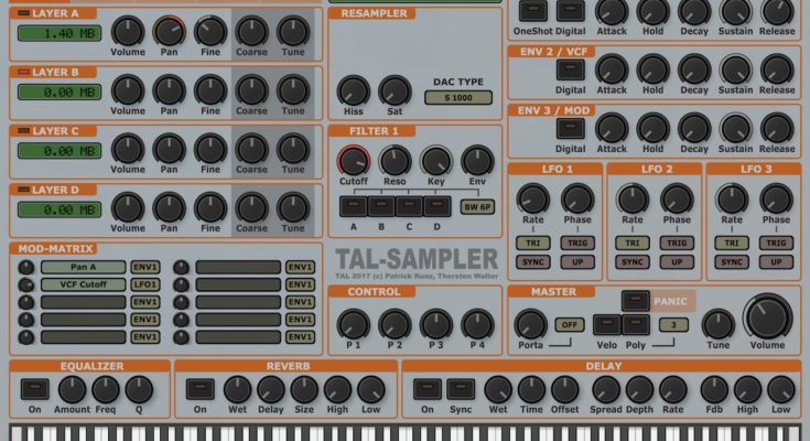 TAL-Sampler is not just a sample player. This is a full-fledged analog synthesizer with a sampler engine as a sound source. which includes a powerful modulation matrix and high-quality 24/12/6 dB low pass filters. Don’t expect to see a 40 GB piano sample library or something similar here. The idea of the tool is to return the sampling of the good old days with the help of small samples, fast loading times and an intuitive workflow to create your own sounds, without fear of getting lost in the settings. The tool allows you to select various digital analog DAC converters), and load up to 4 layers simultaneously, plus has SFZ support.