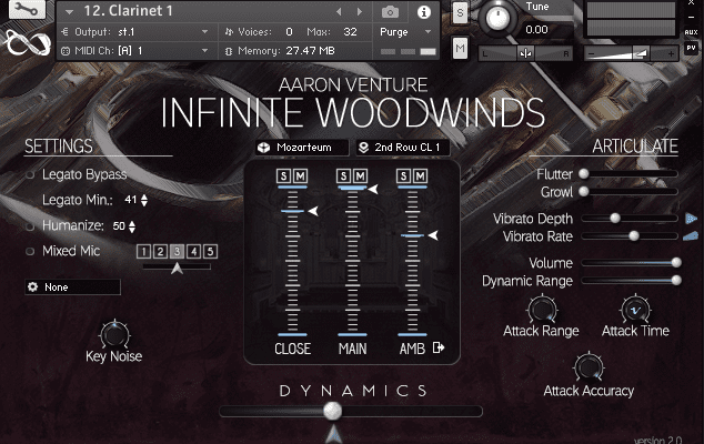 Load an instrument, pick a room, choose a position, dial in your preferred mix of microphone sets and you’re good to go. The only thing left is for you to say what you have to say; Infinite Woodwinds can handle it all. With colors from the shrills of the piccolo flute to room-shaking low rumbles of the contrabassoon and contrabass clarinet; dynamics from pianissimo to fortissimo; techniques from flutters and growls to measured or chaotic trills; and vibrato from romantic and passionate to fast and trembling, Infinite Woodwinds lets you give voice to the music in your head right on your keyboard.