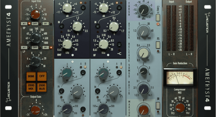 Amethyst 4 is a high-performance channel strip delivering the warm sound of some of the famous British consoles of the late 70s and early 80s. The Amethyst channel strip includes three sections: a preamp, an equalizer plus filters, and a dynamics processor.