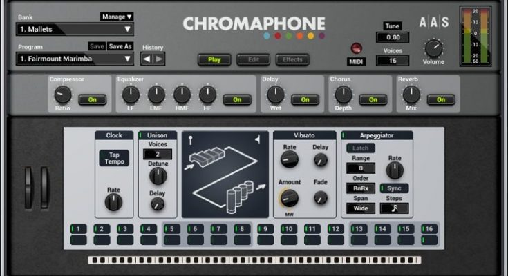 Content: Chromaphone has excellent features: keyboard modes, unison, portamento and sliding functions, as well as a full range of MIDI functions. And for even greater capabilities, Chromaphone provides a custom programmable pattern arpeggiator and high-quality effects.