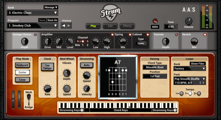 Strum GS-2 is a plug-in for creating guitar tracks. With a huge collection of acoustic and electric guitars, automatic chord recognition, sophisticated chord voicing, integrated strumming and chord picking, a MIDI riff library, amp and effects, playing guitar on the keyboard has never been easier.