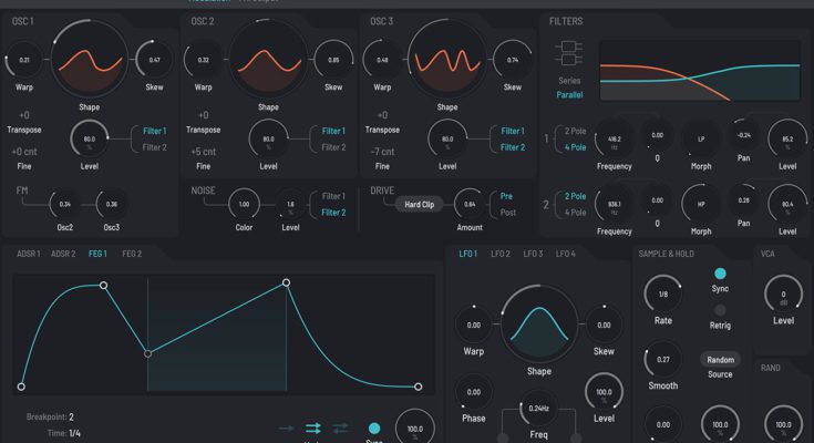 The four FLFOs utilize four controls (phase, shape, skew, and warp) to access a virtually limitless palette of waveforms, and feature host tempo sync and retrigger.