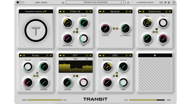 This plugin kills static mixes. We’ve teamed up with Andrew Huang to create a Transit FX plugin that will super-power your mixes. Use it for build-ups, falls, motion effects, lifts and sweeps – and keeps your listeners on their toes at all times.