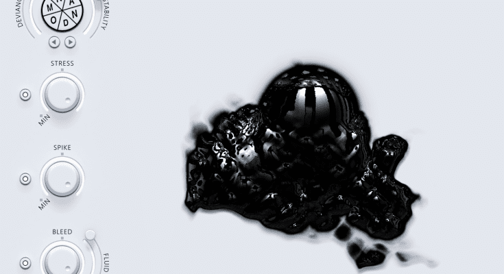 The soundscape is further shaped by STRESS, which dictates the length of the synth’s decay. Meanwhile, the SPIKE knob imparts an aggressive quality, with darker, warmer tones at one end and a more assertive, edgy palette at the other. BLEED and FLUID provide a delicate dance of influence across the resonator, allowing subtle modulation of colour and presence.