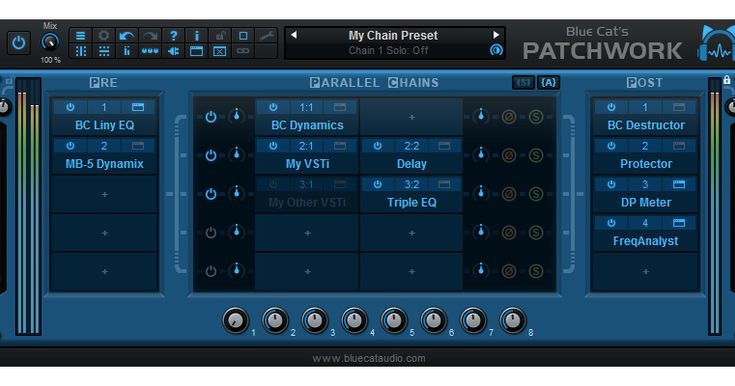 Blue Cat’s PatchWork is a versatile plug-in patch panel that allows you to connect up to 64 plug-ins in one instance in any sequencer. It allows you to connect effects in series or create up to 8 parallel chains, which can be activated independently. This allows you to create your favorite configurations from effects or instruments, without the need for multiple buses. The configuration can be saved as a preset. The plugin is available as a tool and as an audio effect.