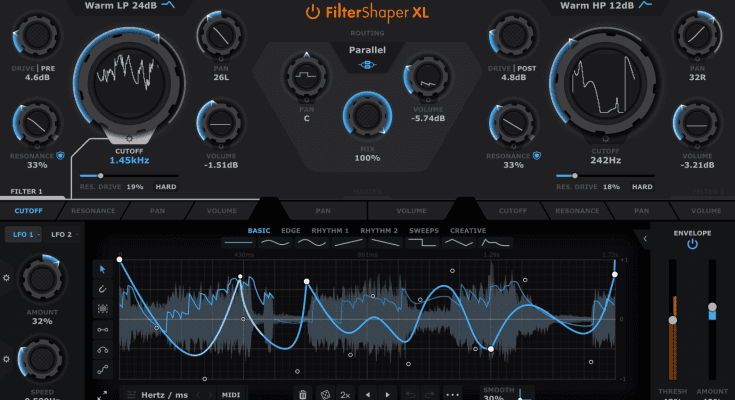 FilterShaper XL takes a giant leap in unconventional sound design with two powerful filters, a multi-stage drive and an extremely flexible modulation system. Turn synths into twisted mutations that pop out of the speakers. Turn bass lines into bubbly, pulsating patterns.