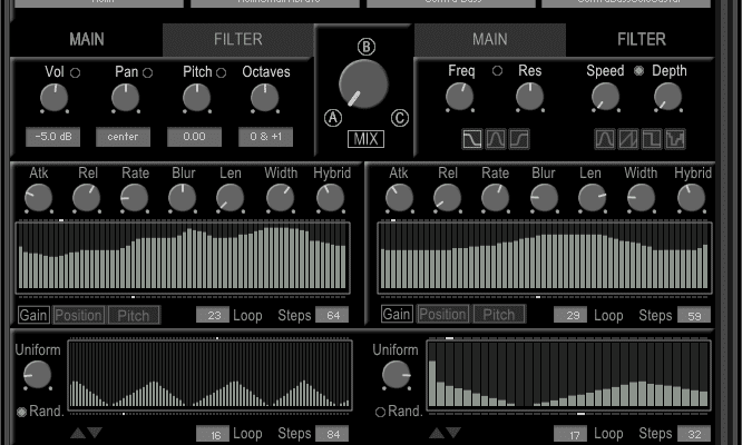 Orchestral Dust gives you independent maximum control over grain reproduction for each voice. You can choose the gain (volume), the position of the audio file and the pitch of each grain, and in each of them you can configure your own loops for modulating and developing the sound.