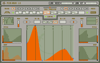 PicaDrum (VST plugin) is an 8-voice FM synthesizer. Designed for creating powerful drum sounds and sharp effects, as well as dry bass sounds and synth lines.