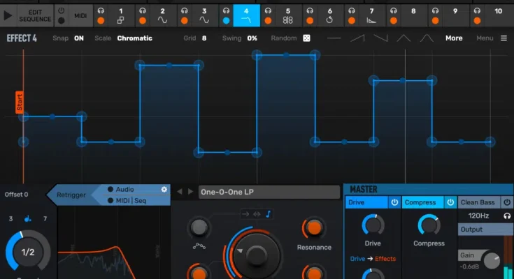 Each effect has two tempo-synchronized multi-segment envelopes for modulating key parameters. Generate random patterns, Euclidean rhythms, swing and pitch locking.