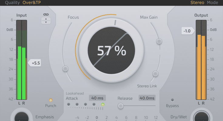Boost technology developed by UrsaDSP increases the volume of audio material. Use it as a signal booster during mastering or to reveal hidden details when mixing or creating new sounds. Set the output ceiling, set the attack and release times, and use the master gain control to achieve anything from a slight increase in average volume to complete rejection of the signal.