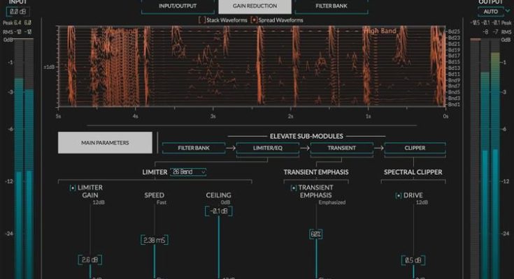 Elevate is the most advanced mastering plugin that has ever been created. This is a unique multi-range compressor, with a specialized equalizer and a powerful limiter, which will preserve and improve its dynamic perception. It analyzes 26 frequency ranges and changes the gain, response speed and transients for each band in real time.