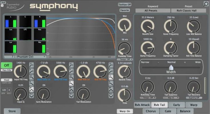 Symphony is the pinnacle of Exponential Audio reverb processing. This character reverb mechanism is a complete solution for creating unique, exciting spatial effects for multi-channel music or post-projects. Thanks to independent parameter modules for attack, early reflections and the tail of your reverb signal, as well as separate balance controls, creative modulation and dynamics effects, Symphony allows you to get the most out of your mix reverb. Try the symphony and hear for yourself!