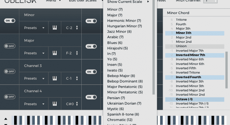 Within Key … – Using only one type of triad for your chords may not sound very good. It is more useful to use both the major and minor triads that match the scale you are using. For this reason, Obelisk has a limiting algorithm that intelligently shifts notes to match a given key and scale. This limitation occurs after the chord is generated – as in the process described in the previous paragraph. The received MIDI is then sent to the synthesizer of your choice.