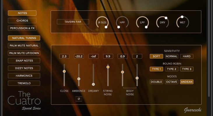 In addition to being a powerful tool for creating authentic South American music, The Cuatro is perfectly suited to modern productions such as pop, chill-out, folk music, film scores and other genres. With its open, organic sound, it can easily use effects such as reverb, EQ, delay, chorus, phaser and anything else you can think of.