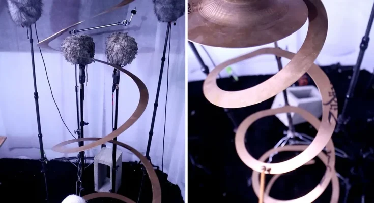 Therefore, all possible ways of creating sounds were explored: from simple dirty crash sounds to drops, tremolos, strokes and taps with various mallets. A total of six tracks were recorded: two Trance Audio contact microphones on a cymbal dome, plus two Sanken CUX-100K stereo microphones and two Sennheiser MKH 8040 stereo microphones.