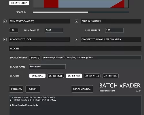 – When selecting loop size, make sure that the end portion accounts for any space at the end which may exist, for example if auto sampling the files may have a release section recorded. In fact when auto sampling it’s best to keep the release section as short as possible as far as Batch xFader is concerned.