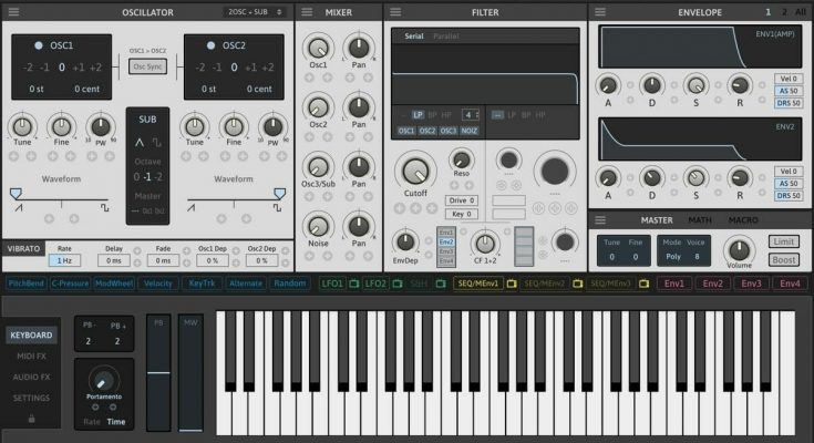 The oscillator section also includes an optional third oscillator and modulation oscillator that supports FM, ring modulation and FM feedback. There’s a MIDI FX section, and it adds numerous goodies like the insanely flexible arpeggiator, MIDI harmony, note echo, velocity instruments, and more. The audio FX section has over twenty additional effects. There are also macro controls for setting multiple parameters at the same time.