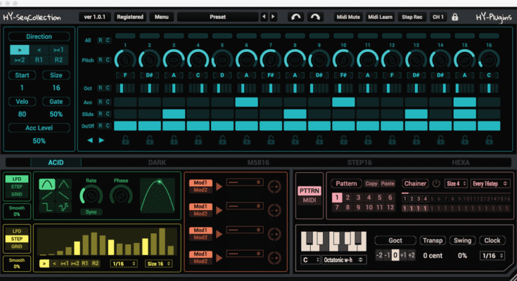 This is a multi-mode sequencer plugin. There are 6 sequencer modes available (Acid, Dark, M5816, Step16, Hexa, Euclid). 4 modulation signal generators and 8 macros are available for modulating parameters.