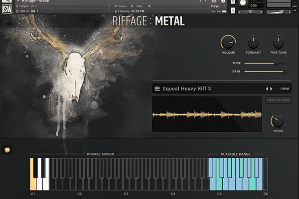 Riffage: Metal Phrases, played on a Gibson Explorer with a Dirty Fingers pickup, cover a huge variety of riffs, phrases and chants recorded in three different tempos: 80, 120 and 160 beats per minute. However, phrases can be played at almost any tempo without artifacts. Up to 46 phrases can be assigned to the key switches (C1 to A4).