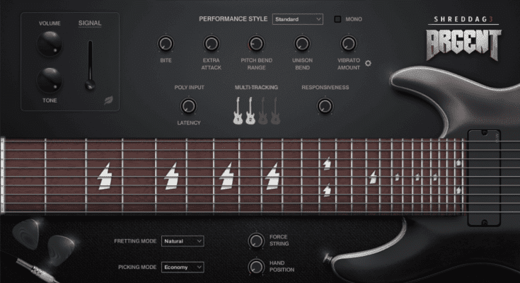 “Argent metal” has a particular aggressive, single-string rhythm sound that we wanted to capture, which inspired our choice of instrument (Schecter Damien Platinum), the EMG 808 pickups we chose, and the way we approached the sampling process. We set out to create the ultimate chugging rhythm guitar, and we succeeded! But the Shreddage 3 Argent is so much more. It’s an extremely versatile guitar that absolutely excels at low-end rhythms and chugs, and excels at leads too. Take it to even the most extreme and aggressive sections, and it’ll handle them with aplomb.