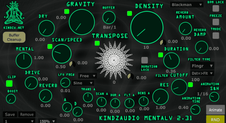 The main controls are Transpose to transpose the sound. Density, number of granules, synchronization of BPM with BPM. Position Scan, audio buffer scan. Duration, granule duration, Dur.Lock mare granule size are density dependent so they do not overlap. A, D, R is the control of the damping of the rise and release of individual pellets, this control is subtle, there is to prevent clicks. Lfo is also available for transposing and scanning. small buttons next to large buttons – stereo parameter shift. Animation is animated by multiple parameters in real time, animation speed is A time, animation of Anim SH samples is synchronized with beats per minute. RND instant parameter randomization. During animation, the animation options are not available for you to control. BUffer, the size of the buffer to store the sound.