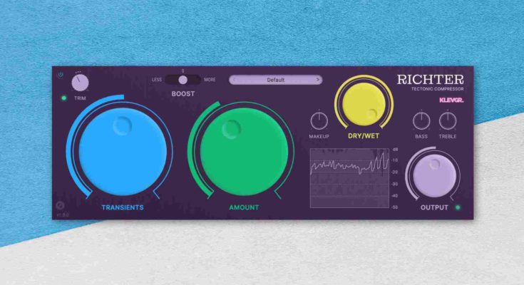 Unusual compressor. Richter is a tectonic compressor designed to achieve strong compression with minimal artifacts. This is the result of many years of experiments in the Klevgrand laboratories. Typically a heavily compressed audio signal is distorted, often with a nasty “lightning noise” artifact due to the way the internal envelope followers are designed.