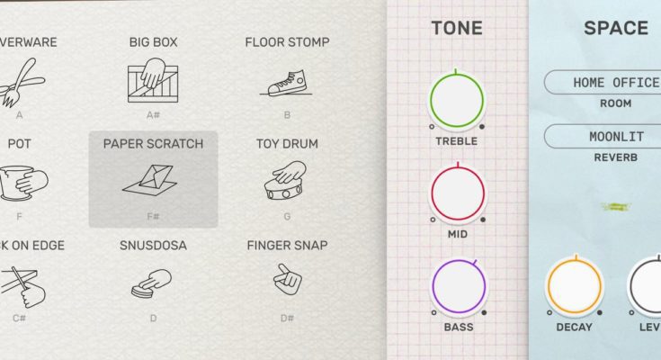 Contains 12 different percussion sounds created from hit records of household items (such as silverware, a sofa, a toy drum or a pair of car keys). Each sound was carefully sampled and processed for musical performance. Ting is designed to be a creative instrument and a replacement for conventional percussion instruments. In total, ~ 500 separate samples are used to make this instrument.