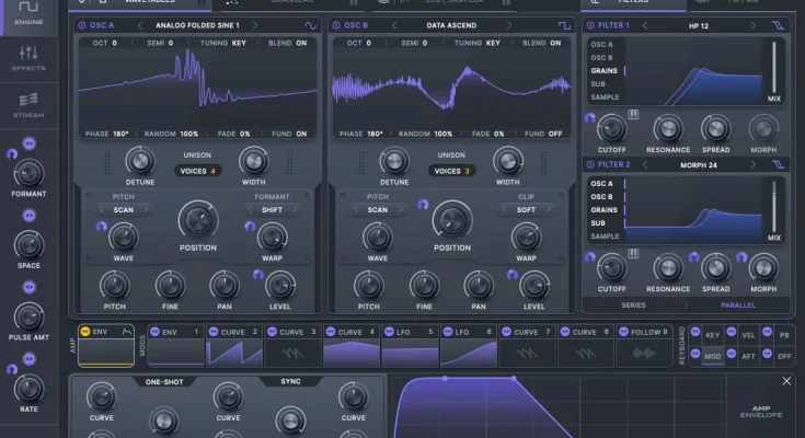 With Current’s dual oscillators, you get a whole range of wavetables. The possibilities are endless, from raw analog vibrations to the grace of bowed strings. Plus, with slots for wave and warp effects, audio manipulation reaches new heights.