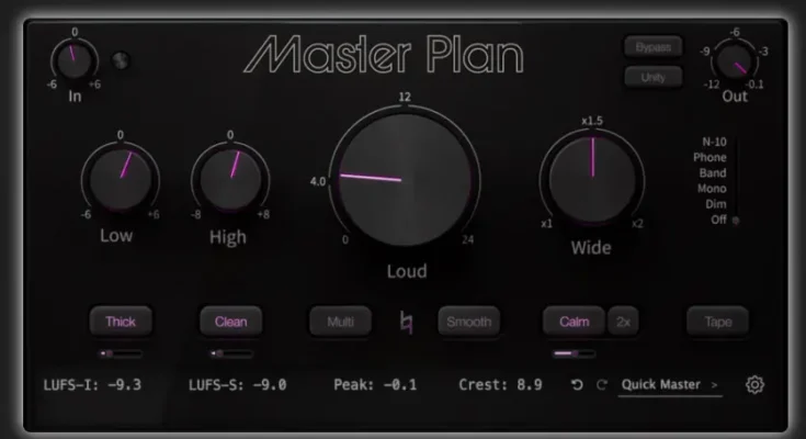 Clear as crystal, loud as a fool! Master Plan is a professional audio mastering workflow that lets you get ready-to-release masters with simple controls: Crystal clear volume, rich analog saturation, phase-coherent visualization, physical tape emulation, and additional tools to fix and monitor your mix .