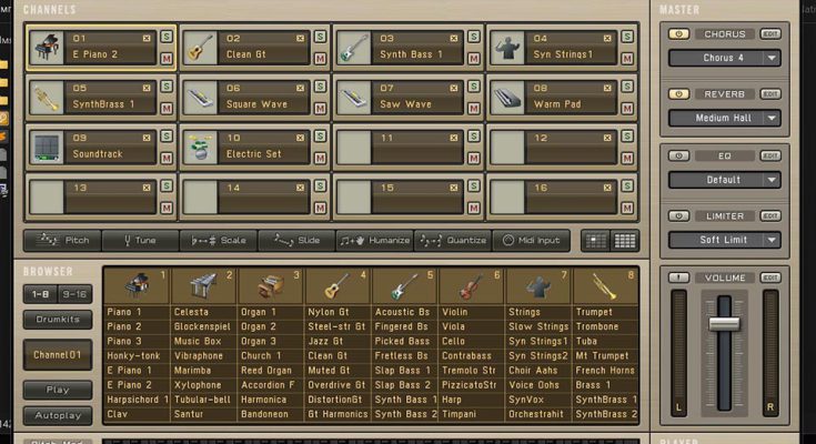 The main control panel offers a convenient overview of all relevant information and parameters. The integrated Instrument Selection Browser lets you select, preview, and move sounds/instruments quickly and easily. The Channel Selection Browser displays all 16 MIDI channels and assigned instruments.
