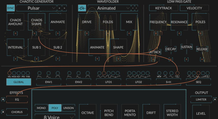 The chaotic synth boasts a wealth of modulation capabilities, with two envelope generators, two LFOS, a sample and hold/random generator, an 8-step sequencer, and MIDI/MPE sources capable of modulating every single parameter.
