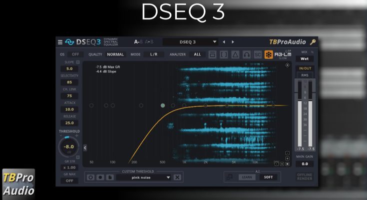 DSEQ is a dynamic processor operating in the frequency domain. DSEQ operates entirely in the frequency domain, providing very high frequency selectivity with self-adjusting dynamic equalizers. DSEQ does its job with maximum transparency. This avoids distortion, phasing and artifacts even with very critical audio material. And DSEQ offers several high-quality modes of taming even single frequencies.