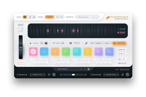 Smarter Chord Bending With Strum, each note bends one by one, giving your bending a natural, expressive feel. Flow lets you decide how chords fit together – closer together, further apart, or crossing in between. Instant Harmony Instantly create new chord progressions with the Harmony Engine. Choose a key and genre to create inspiring chord progressions with the press of a button. Real-Time Mode With the new Real-Time Mode, you can adjust chords on the fly with just your MIDI controller, no sustain pedal required! Create your music instantly, whether you’re on stage or in the studio. Fluid Sound Engine Introducing our hybrid sound engine, powered by our wavetable synth and MPE sampler, designed to bring your chords to life! Combine organic and synth layers for a truly unique sound, ready to bend. Comes with a built-in amp, reverb, delay and compressor. Even more enhancements to inspire you Split and Play Mode Enable Split and Play mode on the Sounds page – simply press a single key to trigger expressive chords with your left hand, while your right hand is free to play melodies. Twice the harmony Now add up to 16 chords instead of 8 – all chromatically mapped from C1 to D3, so you can trigger any chord with a single key – no more limits, just more music. Time and Glide Curve Control the duration of automatic chord bending with Glide Time – set the time in milliseconds or sync to the BPM of your DAW. Then change the feel of the curve with Glide Curve, from smooth and cinematic to dramatic curves Reinvent your synths Place your favorite MPE-compatible synths or samplers into Fluid Chords 2 – Discover expressive chords, intelligent voice guidance, and reinvent them like never before. Narrate your progress Simply drag and drop any MIDI file with a chord progression – Fluid Chords 2 will automatically map each chord to a trigger key. Instant setup, unlimited creativity.