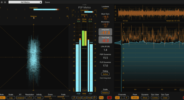 goniometer and Lissajous displays, and fully standard-compliant loudness metering, including LUFS, LRA,