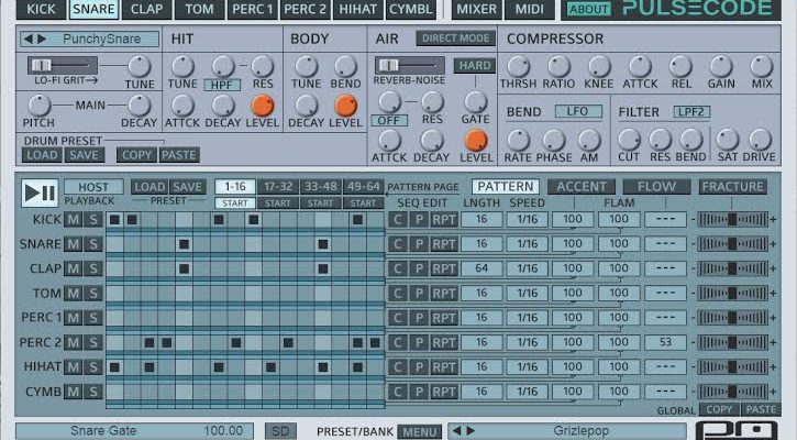 Technology – Each drum sound supplied with PulseCode consists of several layers that can be mixed and customized to create unique drum sounds. Add the Grit parameter for the lo-fi crunch. Add the Hit parameter for the top hit. Add the Body parameter for low frequencies. Add reverb for great sound. Add noise where necessary.