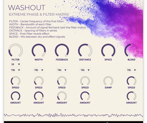 Washout captures the incoming signal and processes it in an animated phase modulation matrix. Each control has its own LFO, which gives you precise control over the phase and offset of the filter. Washout embellishes subtle nuances or creates huge, spatial effects of any sound it encounters.