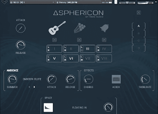 Guitar, tube and bell instruments. Asphericon is a hybrid sampler instrument with 24 beautiful multisampled guitar, tube and bell instruments. Each of them has different layers (variations) that can be mixed with a few button presses. Finally, Asphericon has unique convolution reverb effects, an ambient layer with 20 presets, ambient shimmer effects and guitar amp simulations. The instrument is fully velocity compatible and comes with four global presets.
