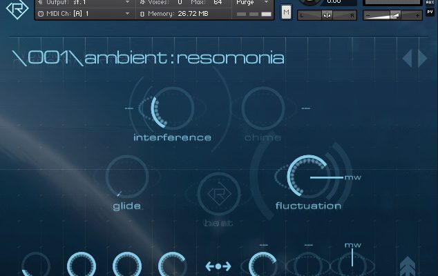 Resomonia is a Kontakt instrument with 128 resonant presets in the Ambient, Hybrid, Pad, Plucked, Wind and Soundscape categories. Resomonia has five controls for modifying the sound, including control over vibrations, interferences and overflows (tuned delays).