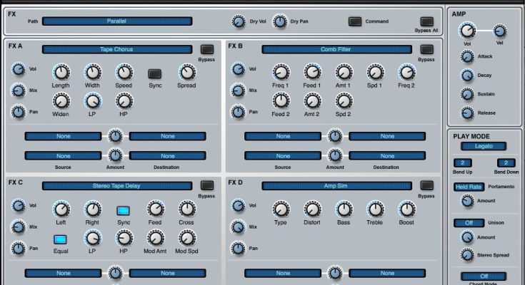 BLUE has six oscillators that can be connected in a variety of ways, two analog stereo filters, a huge range of processing and modulation possibilities, a sequencer and an incredibly powerful arpeggiator.