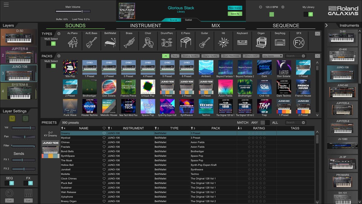 - Shape your sound with dozens of Roland effects, including the RE-201, JC-120, and JUNO Chorus