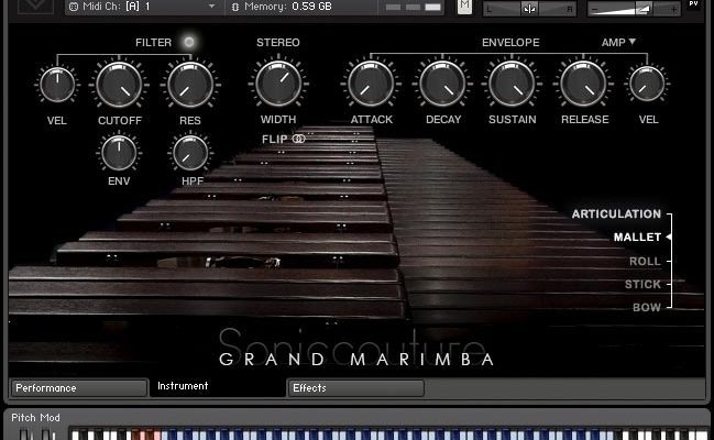 Soniccouture Introduces the Grand Marimba Marimba Sample Library with Yamaha’s 6100, a state-of-the-art instrument that delivers a wider range and precision of tuning The library includes 4 articulations, including basic articulation using 5 types of Mallet hammers, fractions of the phrase Roll, articulation created using the Stick hammer handle and created using the Bow bow.