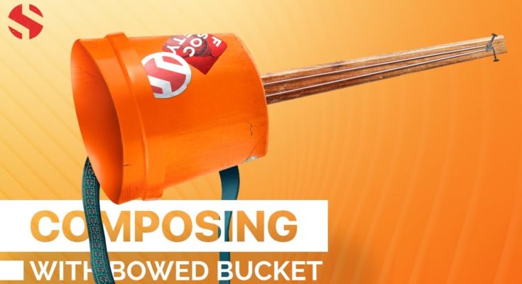 Bowed Bucket is what we got from connecting a plastic barrel, a wooden beam and cello strings . The barrel was equipped with tuning tips, and then holes were drilled in which individual strings pass using the bottom wall as a bridge, so that sound is projected outward and downward. Then a wooden beam was attached to the bucket and the strings were pulled up.