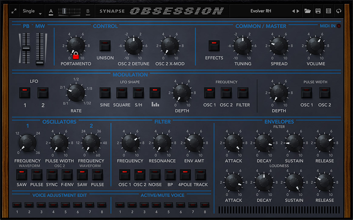 Obsession lets you fully experience the power of a great polyphonic vintage synthesizer. It combines expert modeling of voltage-controlled oscillators (VCOs), voltage-controlled filters (VCFs), and voltage-controlled amplifiers (VCAs) with complex individual tone control that has never been implemented in such detail before.