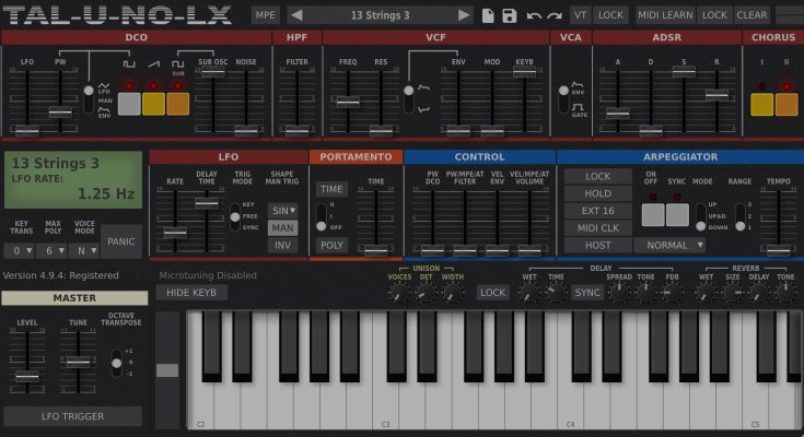TAL-U-NO-LX is a completely rewritten emulation of the popular Juno 60 with a new engine and graphical interface. Modern zero-feedback delay filters and carefully calibrated controls make this synth a good replacement for an analog device with all the advantages of software plugins.