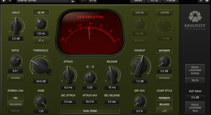 Tokyo Dawn Labs announced the release of its new Molot GE Dynamic Compressor Plugin, featuring a redesigned concept, enhanced flexibility and a generous dose of rock and roll. Molot is the name of the popular dynamic compressor released in 2011 by Vladislav Goncharov.