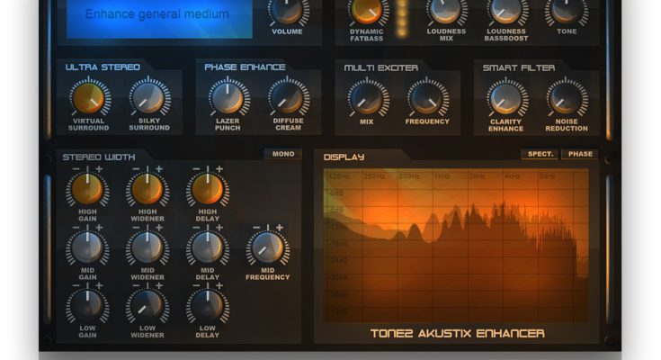 Tone2 – AkustiX – a collection of 6 tools combined in one intuitive, user interface. Ideal for use on tracks as well as on full mixes, AkustiX contains six powerful effects: Psycho EQ, Ultra Stereo, Phase Enhance, Multi Exciter, Smart Filter and Stereo Width. Each effect is based on the latest advances in research and development and offers many ways to radically improve the sound of your recordings using psycho-acoustic processing. Unlike competing enhancers, AkustiX is easy to use and works well with almost any material. This one-click solution will make your mixes sound professional without the knowledge of the tricks of the mastering process.
