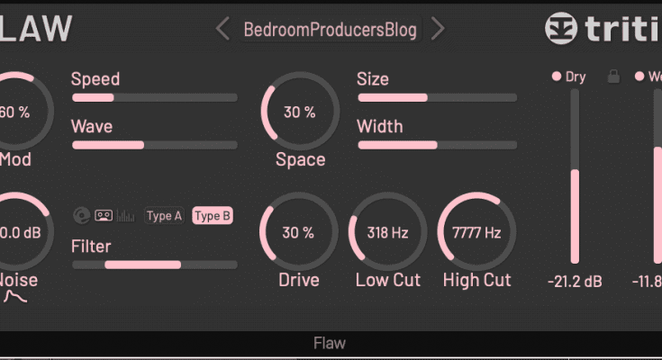 You can adjust the speed and vibration settings to trigger vibrato and effects similar to wah and flutter. Sometimes a fresh take on familiar sounds is all it takes to make things interesting, and Flaw has it. LoFi Reverb with Mix, Size and Width controls doesn’t sound exactly what you would expect from a reverb, but it’s cool!