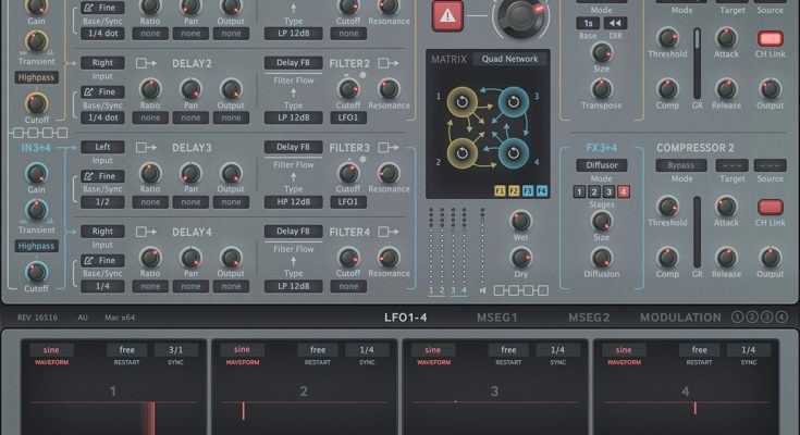 2 Input Processors Input signals can be processed in pairs before being sent to the delay lines. “Transient” controls dampen or boost transients. Two non-resonant input filters can narrow the frequency range or even split the frequencies into two stereo bands with independent delay settings (set In 1+2 to Lowpass and In 3+4 to Highpass with the same Cutoff value). 4 Delay Lines Independent delay modes: synced, free or even MIDI note controlled. The dark box below each knob is the modulation source selector, and the modulation amount is controlled by the “pip” that appears in the top right corner of the knob. 4 Main Filters Resonant filters can be placed in various positions in the signal path. Here you can choose between: 2x low pass, 2x high pass, band pass, band reject, allpass (phaser). Feedback Matrix Here you can specify how the delay lines interact with each other: the “Custom Matrix” option allows you to freely route the signals between all 4 delay lines. The large knob at the top controls the overall amount of feedback. At the bottom of the panel are the output level controls, allowing you to use normal and inverted polarity. 2 Effects Pre-feedback processing. Here you can choose between: Limiter, Bit Crusher, Phaser, Frequency Shifter, Low/High Pass Filter, Granular Pitch Shifter, Diffuser (Reverb). 2 Compressors The final polish! Compression in peak or RMS mode. In PeakComp mode you can compress one pair of channels using the sidechain from the other. Key Features • New in version 2.5: Input section with gain, filter and transition balance • 4 delay lines with independent absolute time or tempo sync modes • Each delay line has its own multi-mode filter: 2x lowpass, bandpass, 2x highpass, notch or all-pass • 6 default delay configurations or custom matrix (freely route signals between all 4 delay lines) • 4 syncable LFOs with 8 waveform options or user-defined shapes • 2 syncable and loopable Multi-Stage Envelope Generator (MSEG) modulation sources