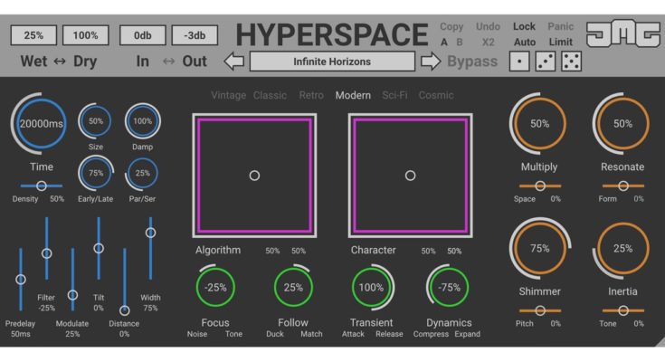 HyperSpace is an algorithmic reverb that allows the user to create algorithms consisting of various processors. The modes “Vintage”, “Classic”, “Retro”, “Modern”, “Sci-Fi” and “Space” allow you to combine various algorithms with endless possibilities. HyperSpace will enrich your tracks with many colors